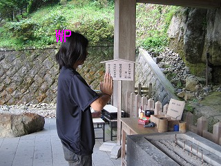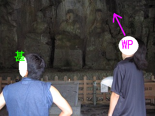 近くの建物で拝観料を払い石仏を拝みに行くめかちょろ軍団.